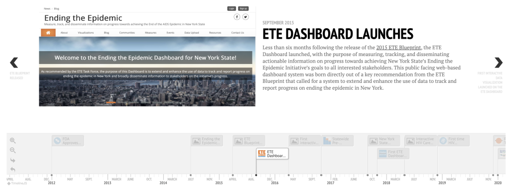 To mark this tenth anniversary, we are releasing the ETE Dashboard Timeline, a new interactive feature that highlights key milestones of the past decade as well as some other contextual events leading to the launch of the Ending the Epidemic Initiative in New York State.